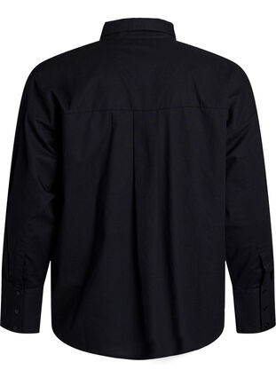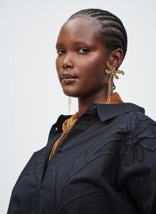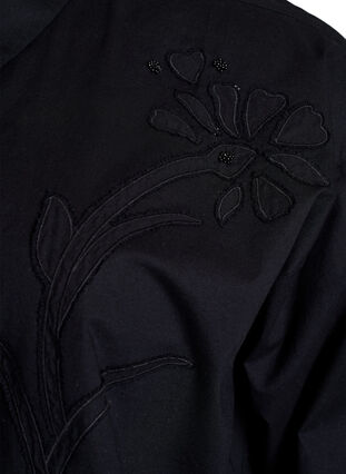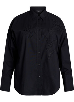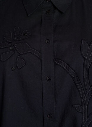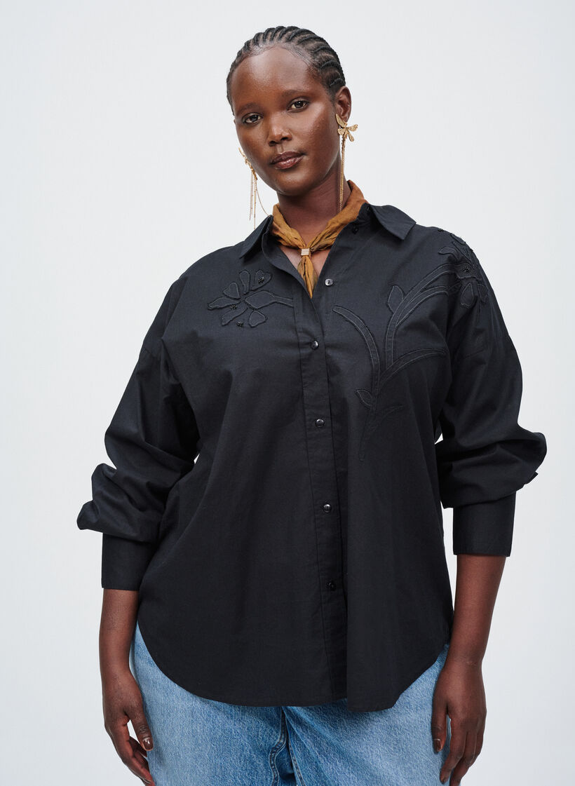 Elegant shirt in 100% cotton with a classic collar and a full button closure. The style features long sleeves with wide cuffs and three buttons, as well as a loose fit with a gently rounded hem. The shirt is decorated with tone-on-tone floral embroidery and small pearl details on the chest, adding a subtle, feminine touch to the simple design.