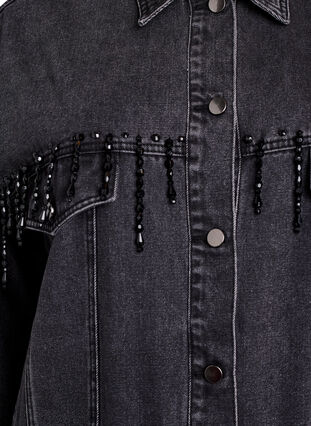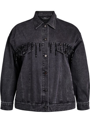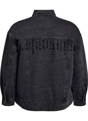 Cool denim jacket with a loose and comfortable fit. The jacket is decorated with pearl fringes on the chest and back, adding an elegant touch. It has a classic collar, button fastening at the front, chest pockets and side pockets.