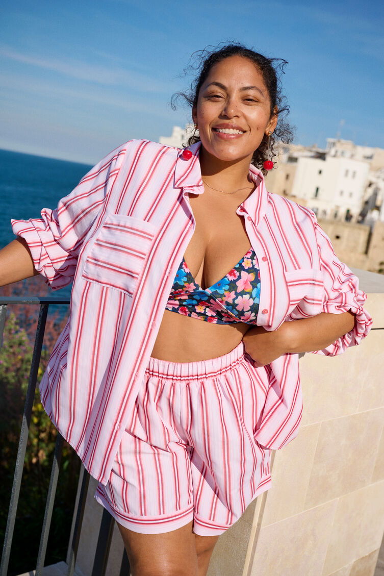 Bikini top in a classic triangle design with a wide band at the bottom for extra support and removable pads that add shape and flexibility as needed. The bikini top ties at the back with adjustable tie straps, creating a decorative cross detail that adds a feminine and stylish touch. Made from a chlorine-resistant and durable material that ensures long-lasting wear and color retention.