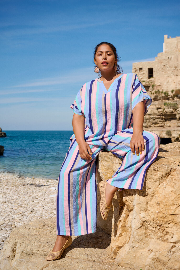 Colourful trousers in a soft viscose quality with a beautiful striped pattern. The trousers have a high waist with an elasticated waistband, side pockets and a comfortable fit with straight and airy legs, draping beautifully from the hip down.