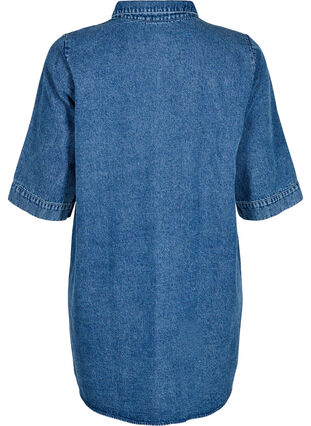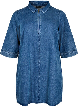 Short denim dress in 100% cotton with a straight and relaxed fit. The dress has a classic collar, short zipper fastening at the front and loose-fitting 3/4 sleeves.