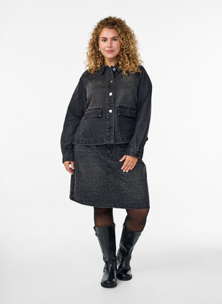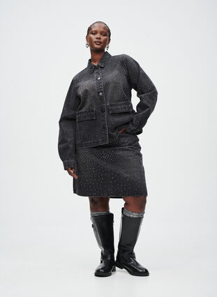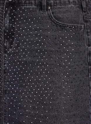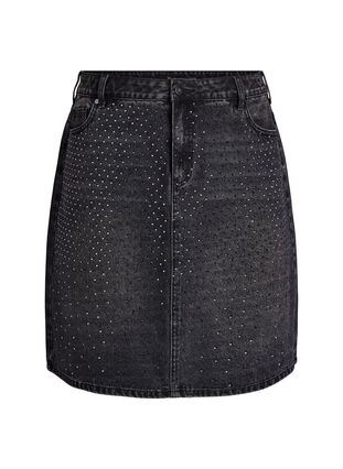 Short denim skirt with sparkly rhinestones on the front, adding a glittery, eye-catching look. It features a classic 5-pocket design with belt loops and a zip and button fastening. The slightly A-line silhouette offers a comfortable fit and makes the skirt easy to style for both everyday wear and parties.