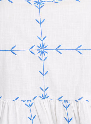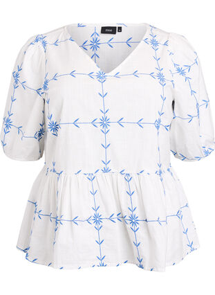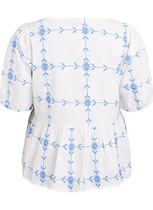 Blouse in 100% cotton with a beautiful graphic embroidery in contrasting colours. The blouse has a V-neckline, short sleeves with elastic cuffs and an A-shaped fit with cutline at the waist for a feminine silhouette.