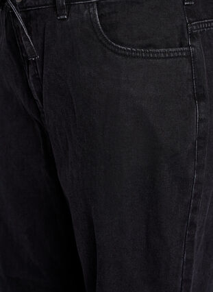Jeans in 100% cotton with a high waist and a narrow tie belt. These jeans have a straight leg and close with a zipper and a button.