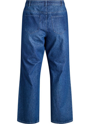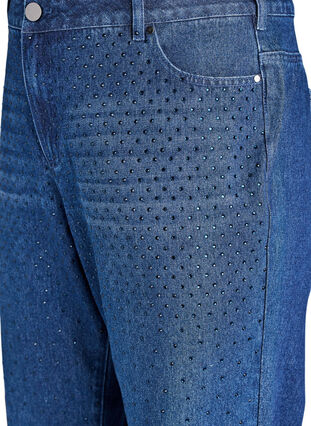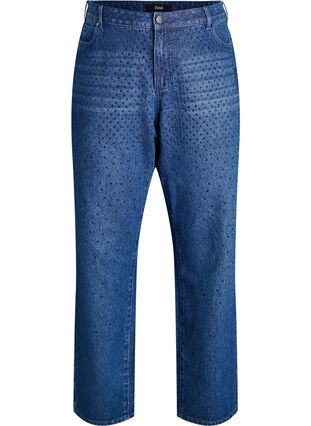 Jeans with small, sparkly rhinestones scattered across the front. These jeans have a high waist and a straight fit, creating a sleek silhouette from hip to ankle. They feature five pockets, belt loops, and a zip and button fastening. Made from a soft, slightly stretchy cotton blend.