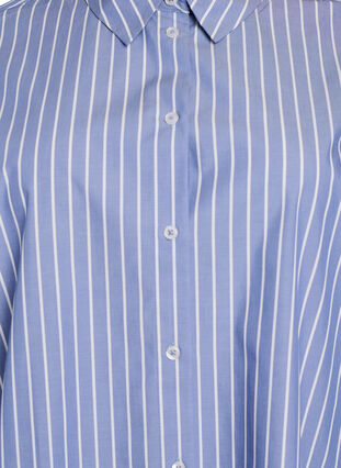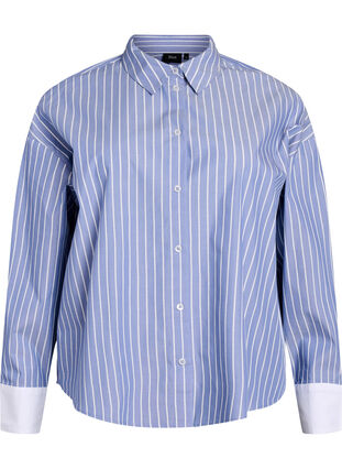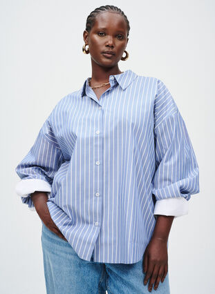 Stylish shirt in a smooth, woven cotton blend with narrow, vertical stripes. The shirt has a loose, boxy fit and classic collar with button closure at the front. The long sleeves end in wide cuffs in a contrasting white, adding a modern twist to the otherwise classic design. The shirt has a yoke with horizontal stripes and a pleat at the back, which provides extra room. Wear it with jeans, suit trousers, and skirts for a smart, casual look.