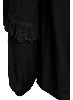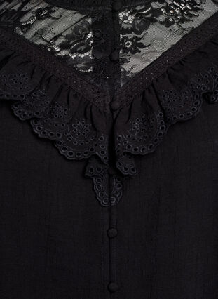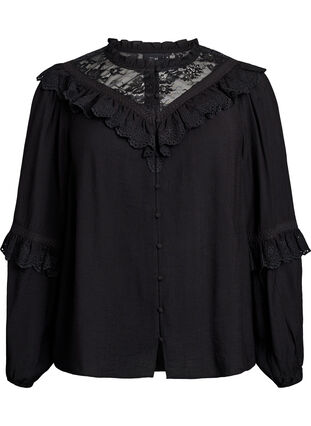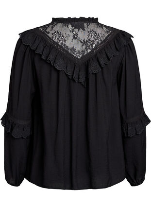 Elegant blouse in a light and textured viscose quality with feminine details. The style features long sleeves with elastic cuffs and a decorative ruffle edge. The back is designed with a lace insert in a V-shape, adorned with a wide embroidered ruffle. The blouse has a loose A-line shape that drapes beautifully and small fabric-covered buttons at the front.