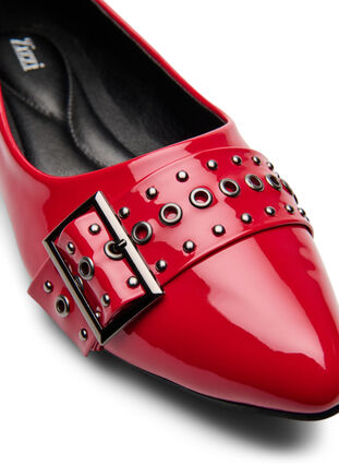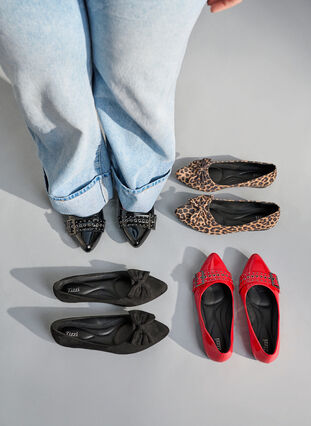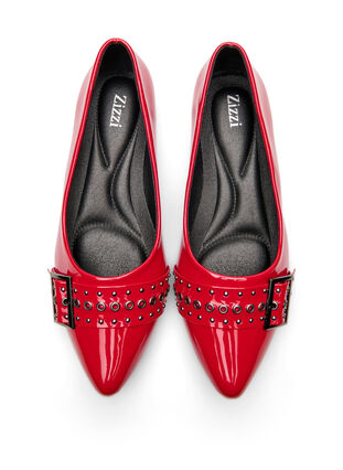 Stylish ballerina with a pointed toe and a wide strap with decorative studs. The shoe is made of faux leather with a shiny patent finish and designed for wide feet. The insole has extra support in the arch and heel, ensuring optimal comfort all day.