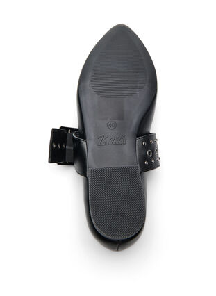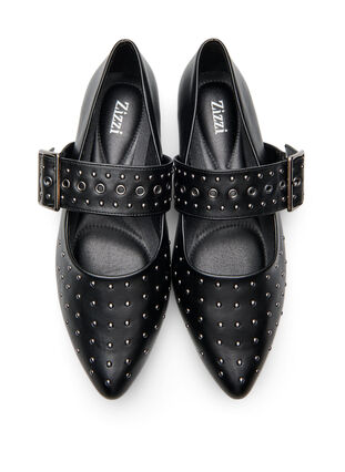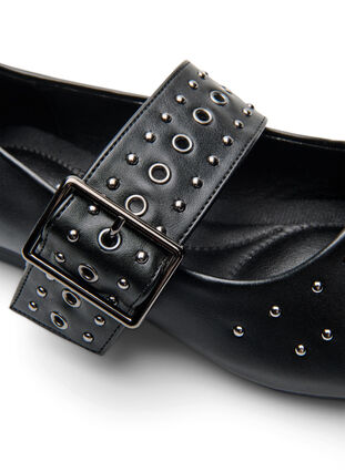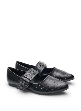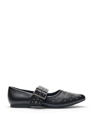 Stylish ballerinas in soft faux leather, designed for wide feet with extra space and comfort. The shoes feature a pointed toe and are decorated with small studs distributed across the upper and the wide, adjustable strap over the foot. The comfortable insole provides extra arch and heel support for good cushioning and all-day comfort.