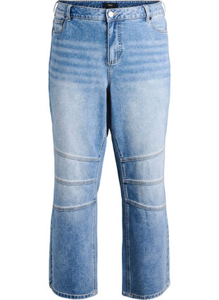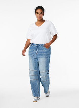 Wide fit jeans with a high waist and an internal adjustable elastic waistband, providing comfort and a flexible fit. The jeans have a loose silhouette from hip to hem and wide legs, creating a relaxed yet stylish look. They're designed with seam details across the thighs, adding a bit of edge. The classic 5-pocket design is finished with a button and zip fly fastening, while the light wash emphasizes the jeans' laid-back style.