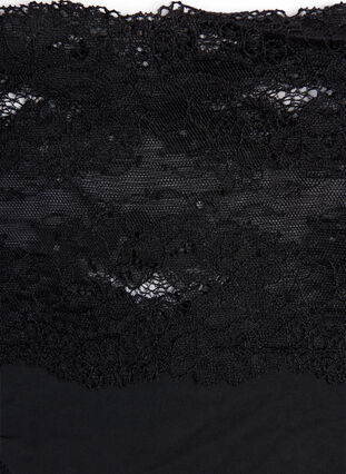 Feminine thong with a regular waist height. The stocking is made in a soft material and has a nice wide lace trim at the waist.