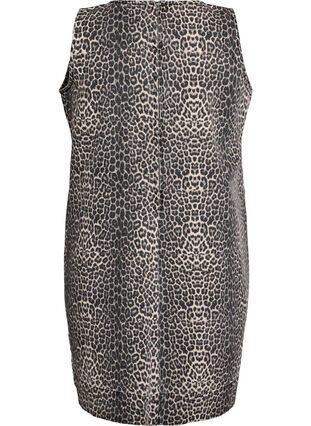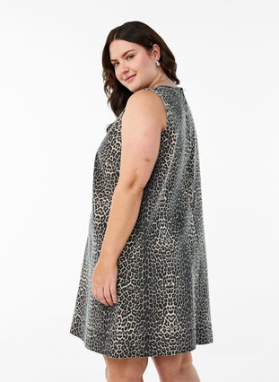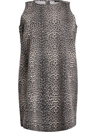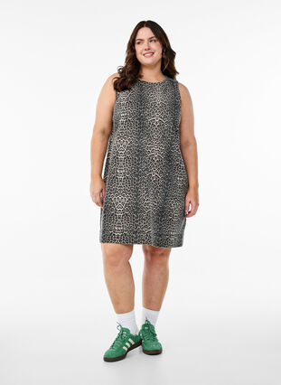 Short denim dress in 100% cotton with leopard print. The dress is sleeveless and has a round neckline with a concealed zip at the neck and a regular fit.